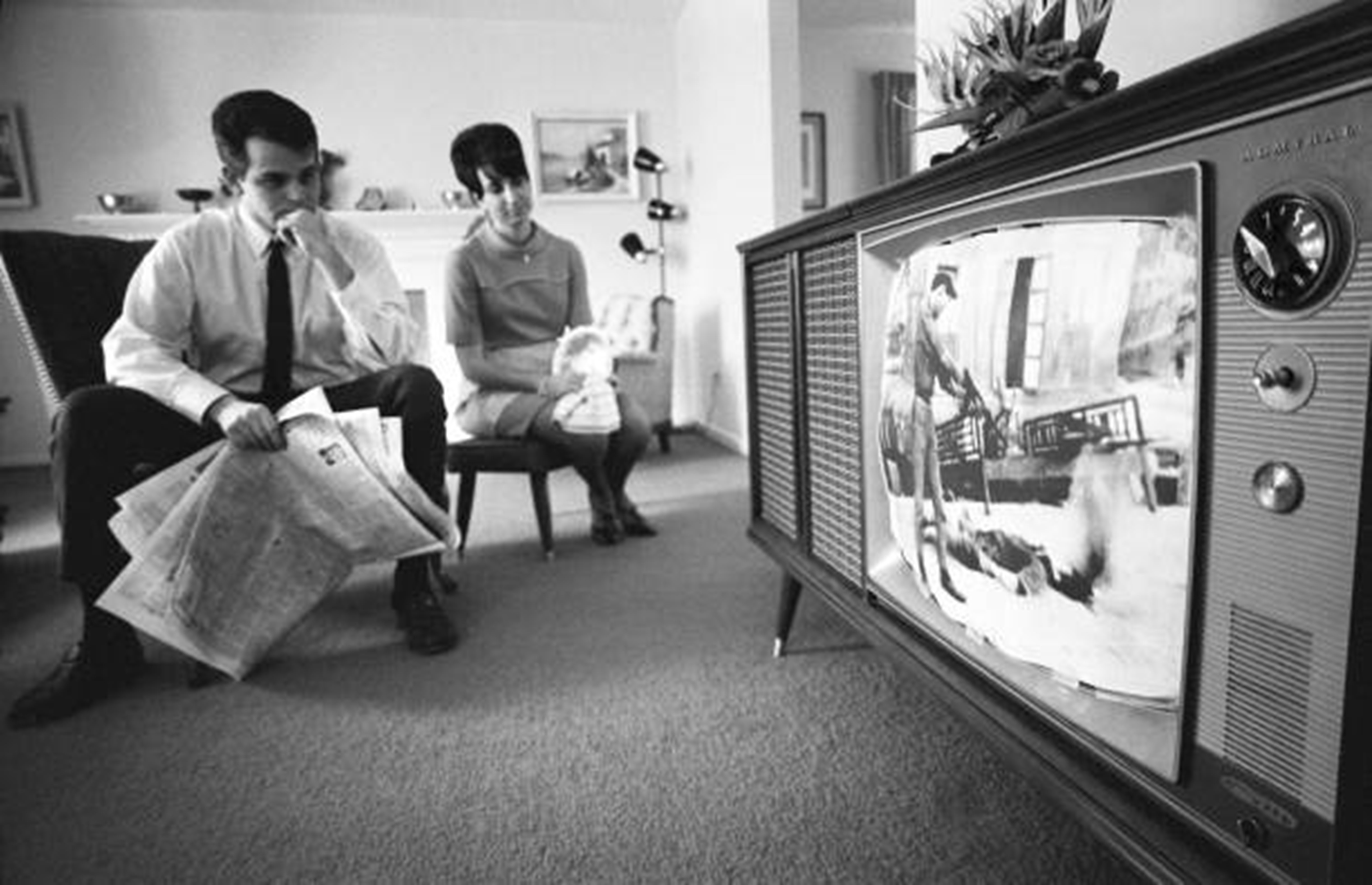 Một cặp vợ chồng người Mỹ ngồi tại phòng khách xem đoạn phim tư liệu về cuộc chiến Tết Mậu Thân năm 1968. Ảnh chụp bởi Warren. K. Leffler.