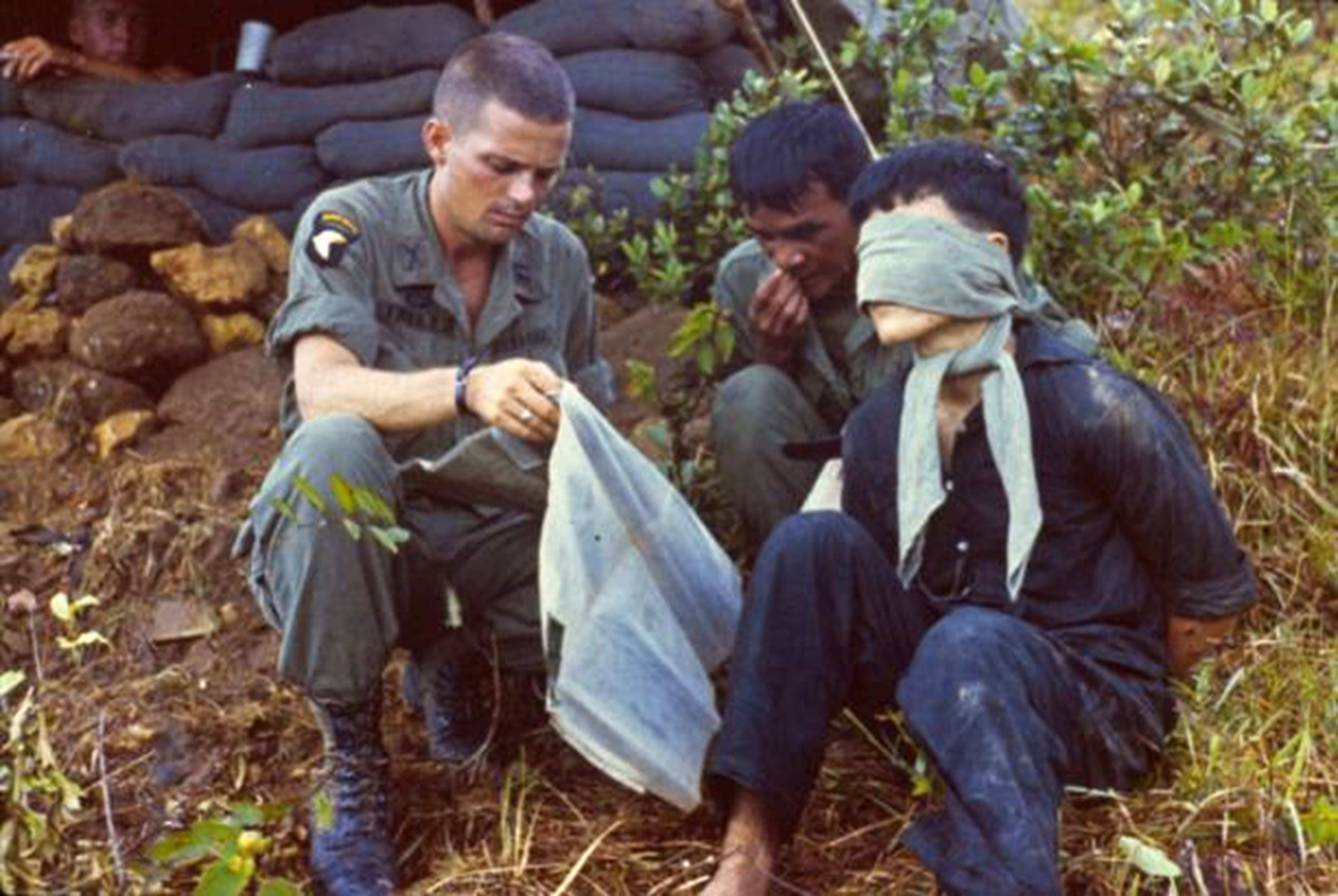 Binh lính Mỹ bịt mắt và tra hỏi một chiến sĩ Giải phóng quân ngày 10/10/1967. Nguồn: MPI/Getty Images