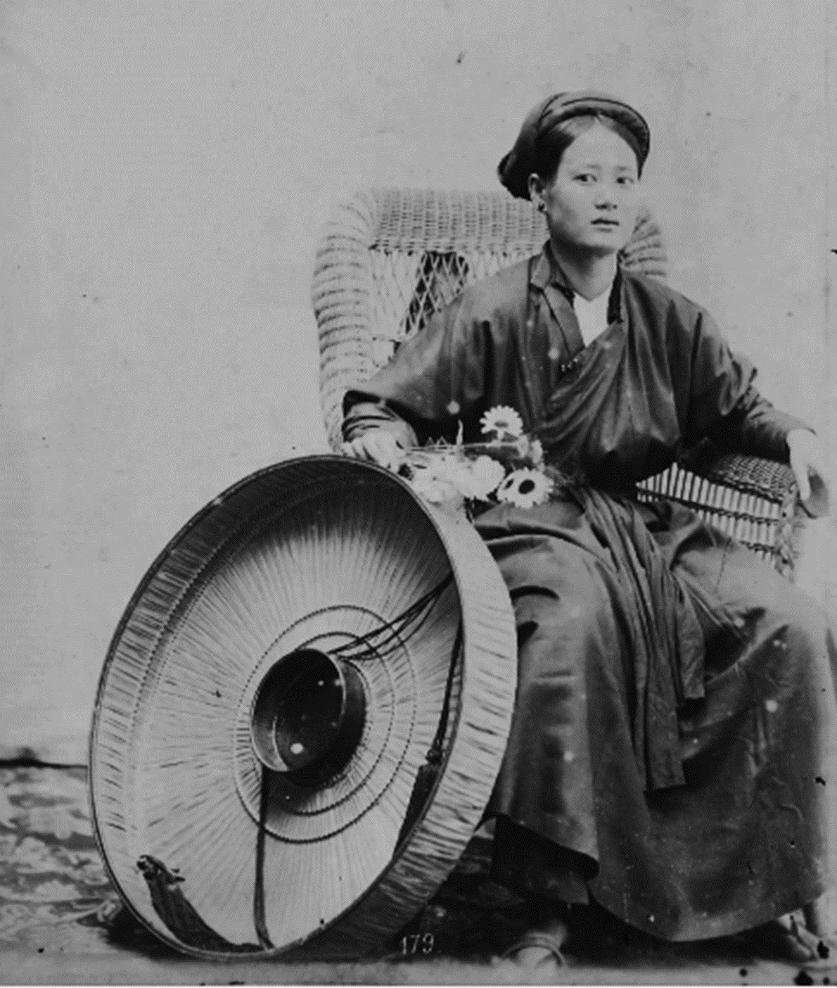 Một người phụ nữ Bắc Kỳ vấn tóc bằng khăn ngồi kế bên chiếc nón quai thao. Ảnh chụp năm 1890 bởi Pierre Dieulefils