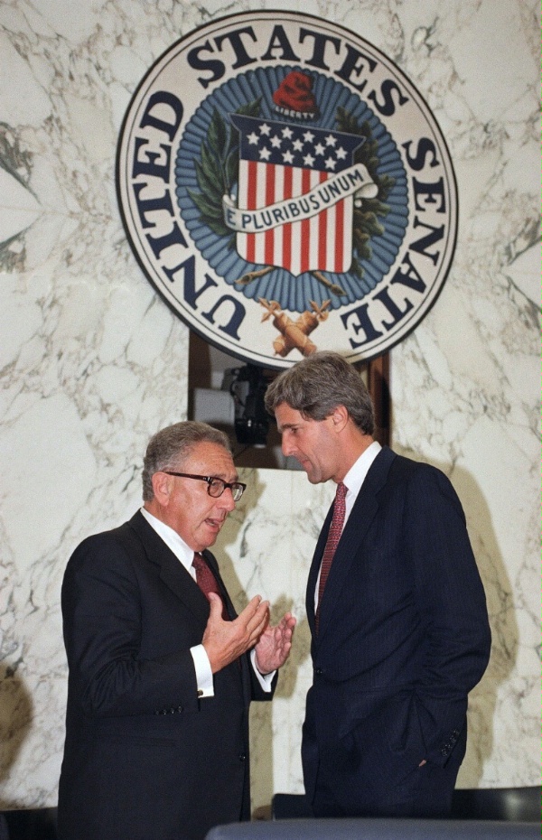 Cựu Ngoại trưởng Hoa Kỳ Henry Kissinger trò chuyện với Thượng nghị sĩ John Kerry, Chủ tịch Ủy ban Đặc biệt của Thượng viện về các vấn đề POW/MIA, ở Capitol Hill, Washington, ngày 22/9/1992. Ảnh: AP