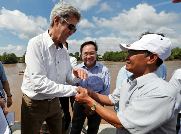 Trong chuyến thăm lại Cà Mau ngày 14/1/2017, Ngoại trưởng John Kerry bắt tay ông Võ Ban Tâm, 70 tuổi, người đã tham gia tấn công chiếc xuồng của John Kerry ngày 28 tháng 2 năm 1969. Ảnh: Alex Brandon / AP