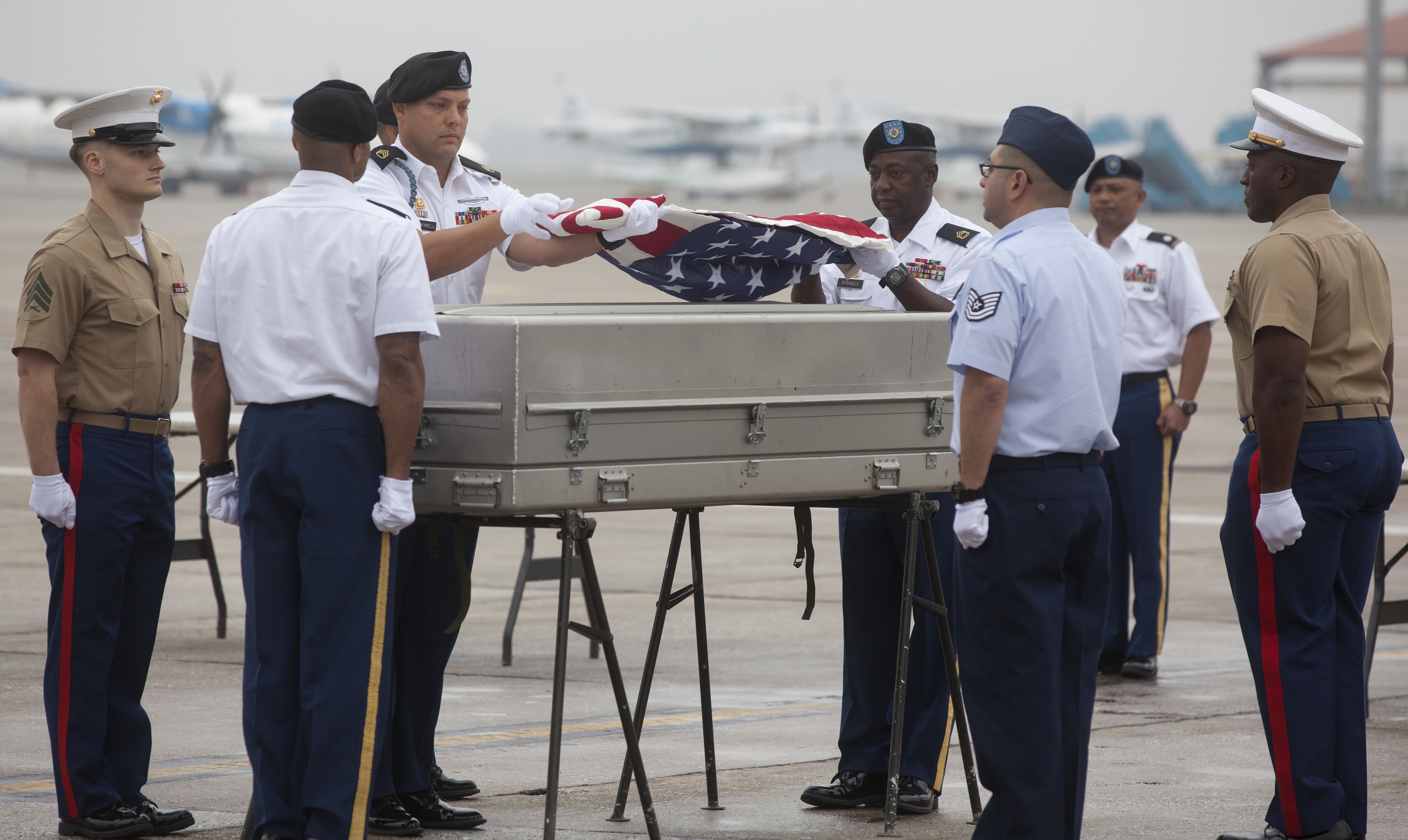 Các quân nhân Hoa Kỳ thuộc Cơ quan Kiểm kê Tù binh/Người mất tích trong chiến tranh (DPAA) phủ lá cờ Hoa Kỳ lên quan tài chứa hài cốt của các quân nhân Hoa Kỳ chưa xác định danh tính trong buổi lễ hồi hương do DPAA tổ chức tại Hà Nội, Việt Nam, ngày 13 tháng 12 năm 2017. Ảnh: Jamarius Fortson / Quân đội Hoa Kỳ