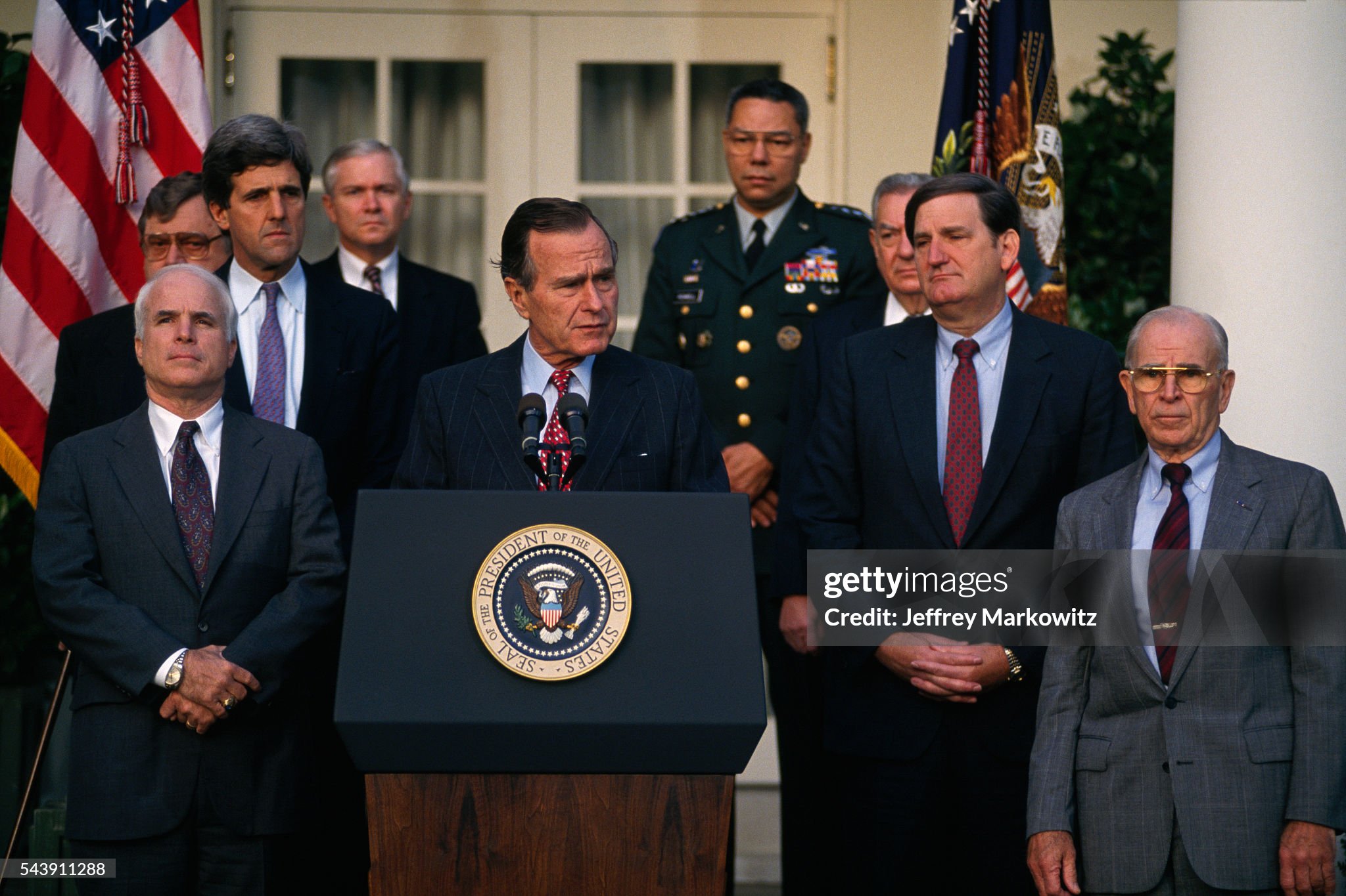 (Từ trái qua phải) Thượng nghị sĩ John McCain, Thượng nghị sĩ John Kerry, Tổng thống George Bush, Chủ tịch Hội đồng Tham mưu trưởng Liên quân Colin Powell và Tướng John Vessey tham dự một cuộc họp báo về các binh sĩ mất tích trong Chiến tranh Việt Nam. Ảnh: Jeffrey Markowitz/Sygma