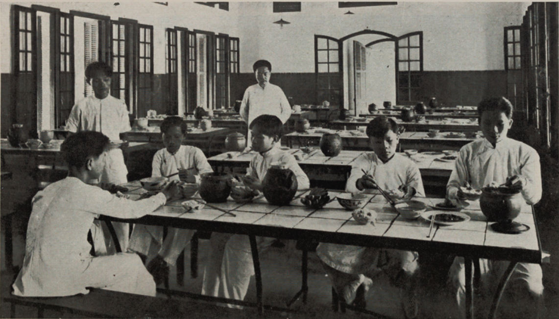 Thực đơn do hiệu trưởng và bác sĩ kiểm duyệt bao gồm nhiều món ăn phong phú: thịt bò hoặc thịt heo thay thế luân phiên với cá hoặc tôm, nêm nếm bằng nước mắm hoặc cho thêm ớt. Mỗi bữa ăn đều có thêm một tô canh rau hoặc canh cá. Học sinh được ăn thoải mái loại gạo chất lượng cao và uống trà An Nam, vốn là thức uống phổ biến của họ.
