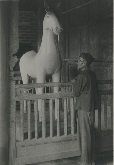 Trong các đền thờ Đạo giáo thờ các bậc thiên tài hoặc những vị thần vĩ đại (đền,miếu), chúng ta hầu như luôn chú ý tới hình tượng ngựa hoặc voi. Những con ngựa, với số lượng hai con, đôi khi kích thước to như thật, được làm bằng gỗ và gắn cố định trên một khung nhỏ có bánh xe. Phủ lên chúng là bộ yên cương và đồ trang trí bằng giấy sơn và mạ vàng, hoặc bằng vải thêu tùy vào sự giàu có của ngôi đền.