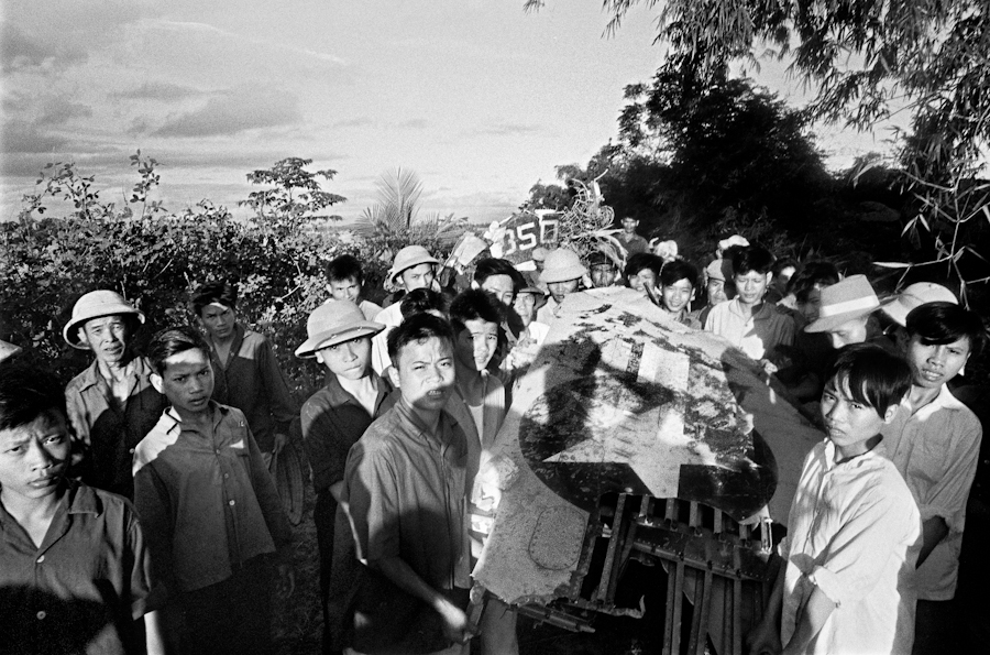 Người dân khiêng một mảnh xác máy bay Mỹ bị bắn rơi, miền Bắc Việt Nam năm 1965. Ảnh: Romano Cagnoni