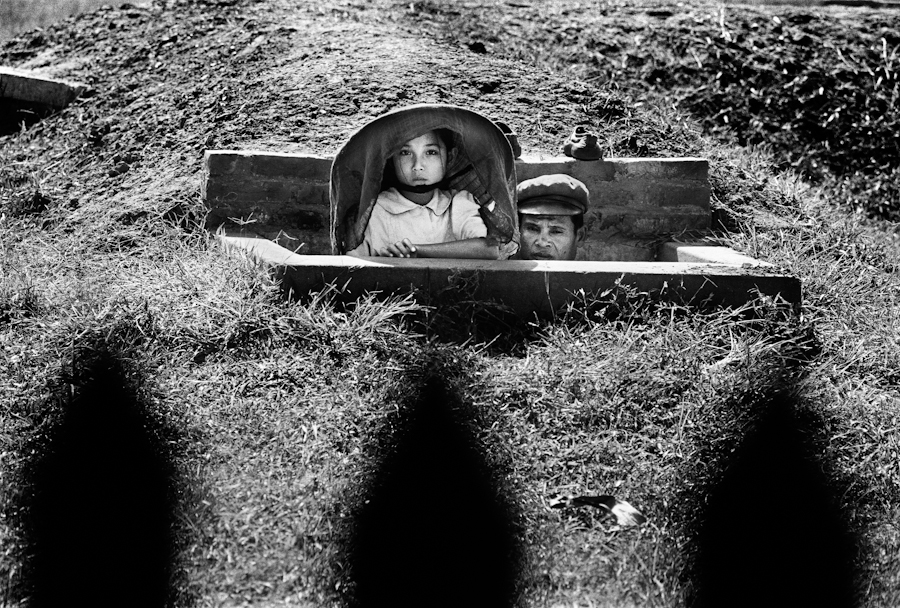 Hai cha con bên miệng hầm trú ẩn, miền Bắc Việt Nam năm 1965. Ảnh: Romano Cagnoni