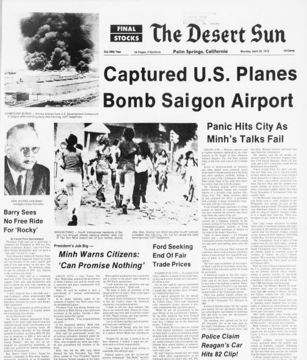 Chúng tôi vừa đi qua cổng chính phi cảng thì một máy bay của VNCH cất cánh khỏi đường băng tan nát đầy khói. Đó là một chiếc máy bay vận tải C-119 cũ kỹ, chưa kịp lên cao quá vài trăm feet (100 – 150 mét) thì một quả cầu lửa xoáy tròn bốc lên phía sau. Một tiếng nổ lớn vang lên khi tên lửa phòng không lao thẳng vào chiếc C-119, khiến nó rơi xuống thành phố. Sự căng thẳng của chúng tôi nhanh chóng chuyển thành sợ hãi, vì chúng tôi sắp được di tản bằng trực thăng. Một mục tiêu dễ bị bắn hạ.