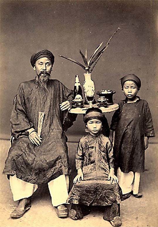 Vài tục của người Annam cũng đáng được nói đến. Nhà chánh hiệu của người Annam được xây bằng đất với tre, lợp bằng tranh, và lợp rất dày. Tranh này được sắp xếp thế nào mà nước mưa không lọt vào nhà được. Vậy là tuyệt, nhưng hễ báo tới (mà bão thì tới hơi thường) thì chẳng còn nóc nhà, mái nhà gì nữa cả. Được cái là những hư hại được sửa chữa rất mau lẹ và hôm sau là đâu đó xong. Nhà thì thường được ngăn ra làm hai buồng, nếu một chiếc chiếu được treo ở trần, thòng xuống, có thể gọi là ngăn chia. Buồng thứ nhứt dùng làm xưởng thợ, buồng thứ nhì dùng làm buồng tiếp khách, buồng ăn, buồng ngủ. Cả nhà, nam, nữ, lớn, bé đều ngủ ở đó, trong một sự gần gũi không được an tâm lắm đối với đạo đức. Giường của họ rất là giản dị. Đó là giường trại lính của nhà binh (Pháp) và người Annam ngủ trên đó một cách sung sướng như là ngủ trên giường rất êm[8]. Về phương diện này thì người Annam rất kỳ diệu, họ ngủ trên ván, trên đá hay trên đất gì thì giấc ngủ của họ cũng mê man, và đôi khi phải đánh họ, mới gọi họ dậy được. Dĩ nhiên đây là nhà của hạng người khá giả, còn bọn nghèo khó thì chỉ có chòi tranh mà ta không thể đứng ngay thẳng trong đó được. Loại chòi này thì khiêng đi được từ nơi nầy đến nơi khác. Người Annam giàu có thì ở nhà xây bằng đá, theo lối kiến trúc Trung Hoa[9]. Đàn ông và đàn bà mặt quần rất rộng và một thứ áo dài cài nút ở bên hông, bằng vải mỏng. Vạt áo đàn ông thì dài xuống tới gối, còn vạt áo đàn bà thì dài hơn tí xíu. Vào mùa đông các bà, các cô mặc chồng chất lên người đến bốn hoặc năm chiếc áo, mỗi áo mang mỗi màu khác nhau. Nón của xứ này che mưa che nắng rất hữu hiệu, chỉ phiền là nón choán chỗ nhiều quá. Chỉ có người giàu có mới mang giày săng đan, còn nhà nghèo thì luôn luôn đi đất.