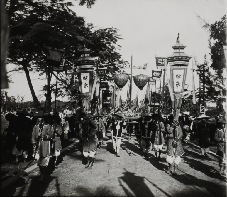 Một đoàn rước linh cữu trong lễ tang của vua Khải Định năm 1925. Nguồn: Lưu trữ của Cao ủy Pháp tại Đông Dương