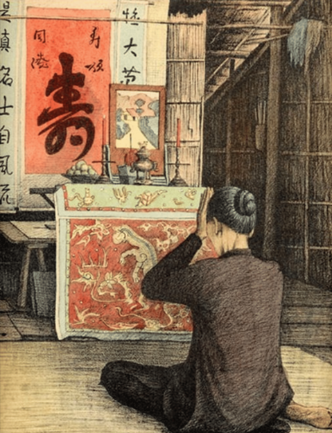 Vái lạy trước bàn thờ tổ tiên ở Nam Kỳ. Tranh vẽ bởi học sinh trường Mỹ thuật Gia Định những năm 1930. Nguồn: Sách “Monographie dessinée de l’Indochine Cochinchine” xuất bản năm 1935